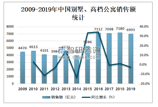 2018年中国别墅、高档公寓销售额为7180亿元,同比增长1.1%;2019年中国别墅、高档公寓销售额为6993亿元,同比减少2.6%。