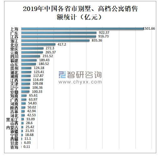 2019年上海别墅、高档公寓销售额为1501.66亿元,全国排名第一;广东别墅、高档公寓销售额为922.37亿元,全国排名第二;江苏别墅、高档公寓销售额为916.73亿元,全国排名第三。