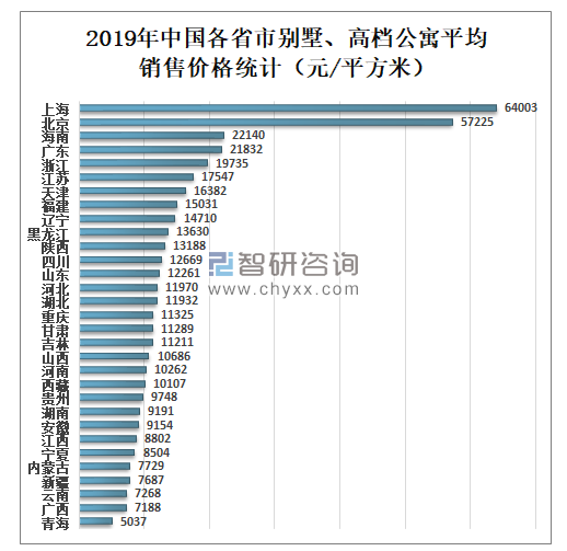 2019年上海平均销售价格为64003元/平方米,全国排名第一;北京平均销售价格为57225元/平方米,全国排名第二;海南平均销售价格为22140元/平方米,全国排名第三。