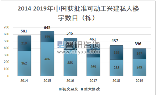2018年中国获批准可动工兴建私人楼宇数目为437栋,其中初次呈交楼宇数目为199栋,重大修改楼宇数目为238栋;2019年中国获批准可动工兴建私人楼宇数目为396栋,其中初次呈交楼宇数目为147栋,重大修改楼宇数目为249栋。
