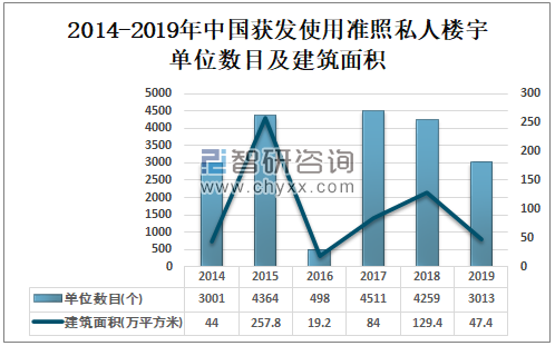 2016年中国获发使用准照私人楼宇单位数目为2014-2019年最低值,获发使用准照私人楼宇单位数目仅为498个,建筑面积仅为19.2万平方米;2019年中国获发使用准照私人楼宇单位数目为3013个,建筑面积为47.4万平方米。