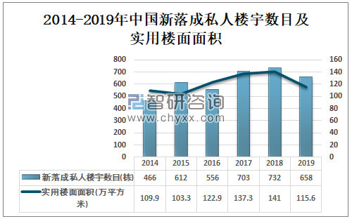 2018年中国新落成私人楼宇数目为732栋,实用楼面面积为141万平方米;2019年中国新落成私人楼宇数目为658栋,实用楼面面积为115.6万平方米,较2018年均有所下降。