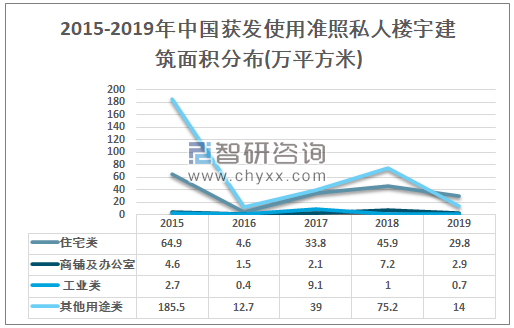 智研咨询发布的《2021-2027年中国楼宇经济行业市场深度分析及投资方向研究报告》数据显示:2019年中国获发使用准照私人楼宇中住宅类建筑面积为29.8万平方米,商铺及办公室类建筑面积为2.9万平方米,工业类建筑面积为0.7万平方米,其他用途类建筑面积为14万平方米。