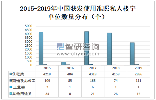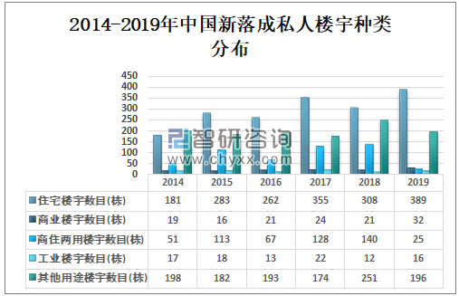 2019年中国新落成住宅类私人楼宇389栋,新落成商业类私人楼宇32栋,新落成商住两用类私人楼宇25栋,新落成工业类私人楼宇16栋,新落成其他用途私人楼宇196栋。