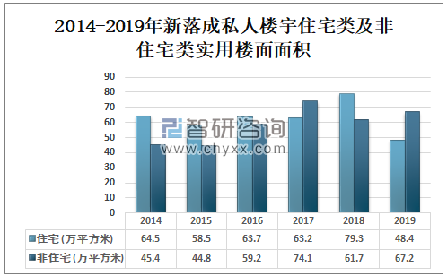 2019年中国新落成住宅类私人楼宇实用楼面面积为48.4万平方米,较2018年减少了30.9万平方米;2019年中国新落成非住宅类私人楼宇实用楼面面积为67.2万平方米,较2018年增加了5.5万平方米。