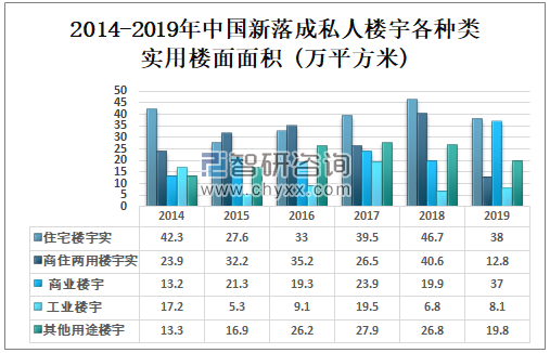 2014-2019年中国新落成私人楼宇各种类实用楼面面积 (万平方米)