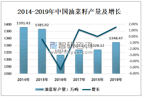 2016年由于油菜籽种植面积的减少,中国油菜籽产量也下降明显,但随后几年中国油菜籽产量都是呈增长态势,至2019年中国油菜籽产量1348.47万吨,比上年增加20.35万吨,同比增长1.53%。