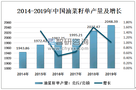 近年来,虽然中国油菜籽种植面积有与产量都有增减,但中国油菜籽单产量却一直呈增长趋势,2019年中国油菜籽单产量高达2048.39公斤/公顷,比上年增加20.92公斤/公顷,同比增长1.03%。