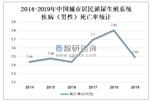 2014-2019年中国城市居民泌尿生殖系统疾病(男性)死亡率统计