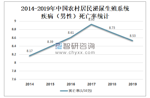 2014-2017年中国农村居民泌尿生殖系统疾病(男性)死亡率逐年攀升,2018年开始下降,2018年中国农村居民泌尿生殖系统疾病(男性)死亡率为8.73/10万,较2017年减少了20.0%/10万;2019年中国农村居民泌尿生殖系统疾病(男性)死亡率为8.53/10万,较2018年减少了19.5%/10万。