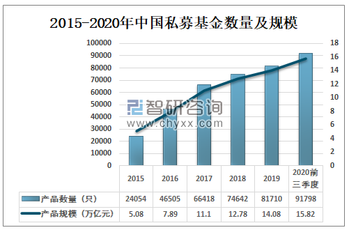 根据中国证券基金投资协会数据显示:2020年前三季度中国私募基金产品数量为91798只,规模达到15.82万亿元,较2019年均有所上升。