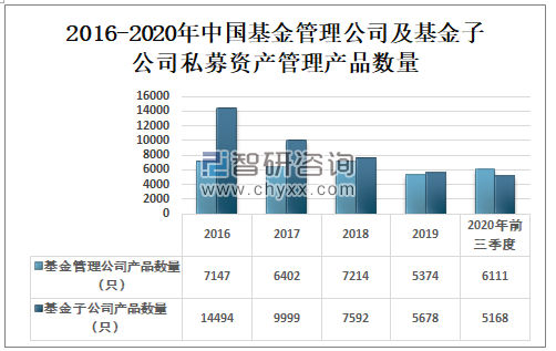 2016-2020年中国基金管理公司及基金子公司私募资产管理产品数量