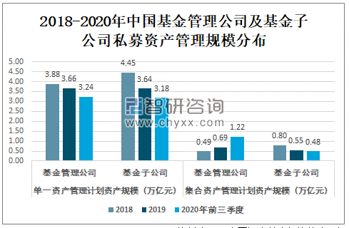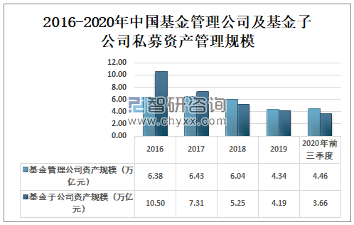 2019年中国基金管理公司私募资产管理规模为4.34万亿元,基金子公司私募资产管理规模为4.19万亿元;2020年前三季度中国基金管理公司私募资产管理规模为4.46万亿元,基金子公司私募资产管理规模为3.66万亿元。