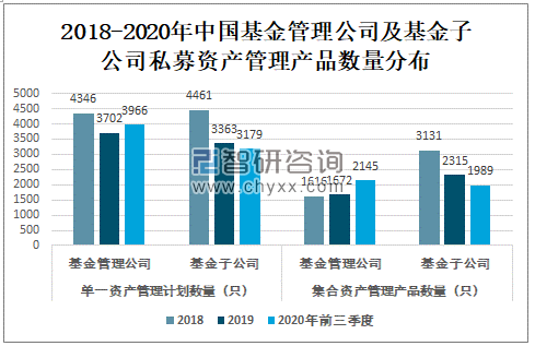 智研咨询发布的《2021-2027年中国资产管理行业市场发展前景及竞争格局预测报告》数据显示:2020年前三季度中国基金管理公司单一资产管理产品数量为3966只,集合资产管理产品数量为2145只;中国基金子公司单一资产管理产品数量为3179只,集合资产管理产品数量为1989只。