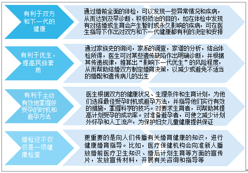 婚前检查是指男女双方在办理结婚登记手续之前进行的常规体格检查和生殖器检查。是对男女双方可能患有的、影响结婚和生育的疾病进行的医学检查。婚前检查的目的是为了有效地预防和控制严重遗传性疾病,指定传染病和相关精神病通过怀孕和生育传给配偶和胎儿,有效地预防和控制新生儿出生缺陷,对防止传染病和遗传性疾病的蔓延,保障婚姻家庭的幸福美满,保障民族后代的健康都有重要意义。