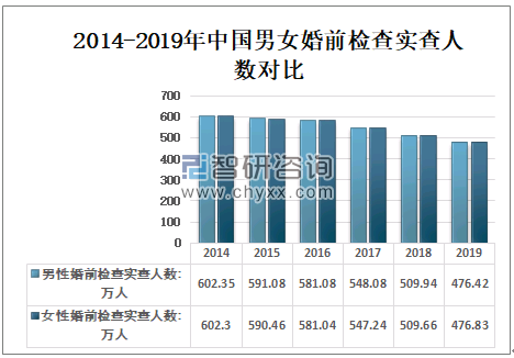 2019年中国男女婚前检查实查人数比上年均略有下降,男性婚前检查实查人数476.42万人,比上年减少33.52万人;女性婚前检查实查人数476.83万人,比上年减少32.83万人。