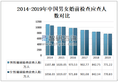2019年中国婚前检查应查人数有1542.05万人,其中:男性婚前检查应查人数771.22万人,女性婚前检查应查人数770.83万人,分别比上年减少71.53万人、71.51万人。