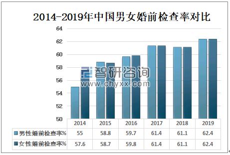 随着人们生活水平大幅提高,保健意识日益增强。近几年,中国男女性婚前检查率均呈上升态势,2019年中国男性婚前检查率达到62.4%,女性婚前检查率也达到62.4%。