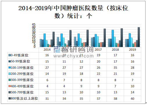 2014-2019年中国肿瘤医院数量(按床位数)统计