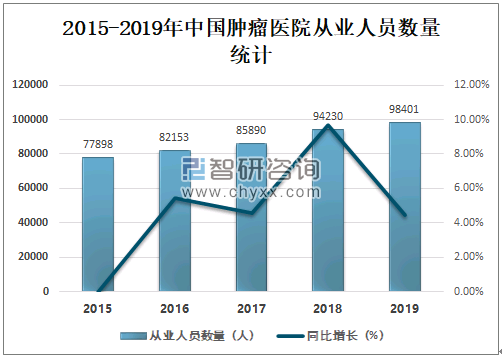 中国肿瘤医院从业人员数量持续增长,2018年中国肿瘤医院从业人员数量为94230人,较2017年增加了8340人;2019年中国肿瘤医院从业人员数量达98401人,较2018年增加了4171人。