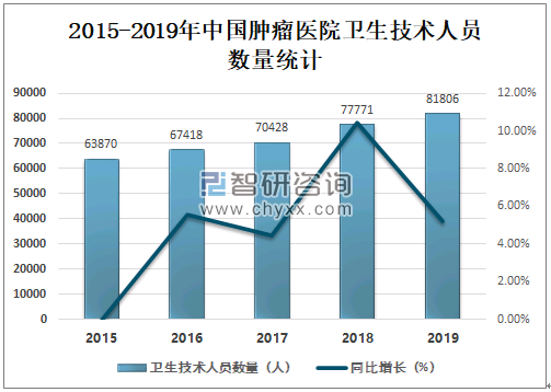 2015-2019年中国肿瘤医院各类卫生技术人员数量统计