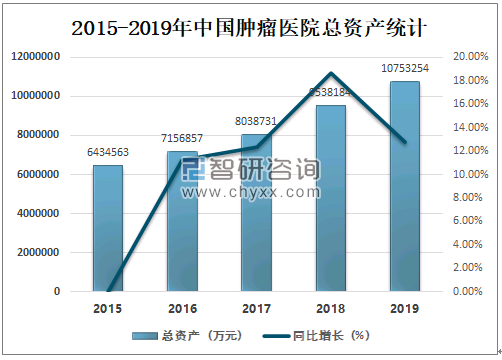 中国肿瘤医院总资产持续增长,2019年中国肿瘤医院总资产达10753254万元,较2018年增加了1215070万元,同比增长达12.74%。