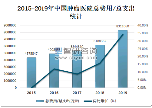 随着中国肿瘤医院总收入增长的同时,总费用/总支出也在增加,2019年中国肿瘤医院总费用/总支出达8311660万元,较2018年增加了2123298万元,同比增长率达34.31%。