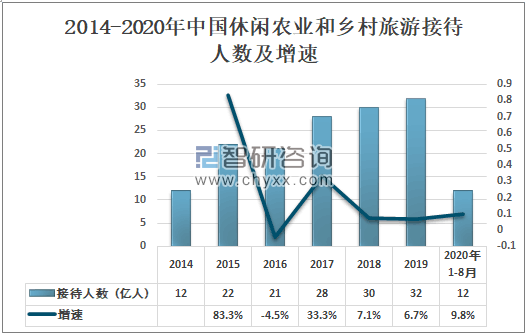 2014-2020年中国休闲农业和乡村旅游接待人数及增速