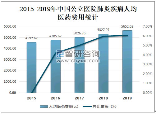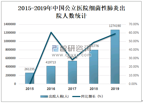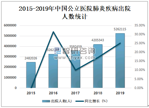 肺炎是呼吸系统疾病中较为严重的疾病类型之一,其中以支气管肺炎更为常见。肺炎发病后除表现出相应症状影响人们生活质量外,由于不同患者间存在个体差异,如老年肺炎患者多合并各类原发疾病,而小儿肺炎患者则因机体各器官系统发育尚未完善从而表现出较重的病情。有科学研究证实,肺炎虽属于一种呼吸系统疾病,但其仍具有一定的致死几率,因此针对此病额危害不容忽视。近年来中国公立医院肺炎疾病出院人数持续增长,2019年中国公立医院肺炎疾病出院人数达5262115人,较2018年增加了1056772人,同比增长率达25.13%。