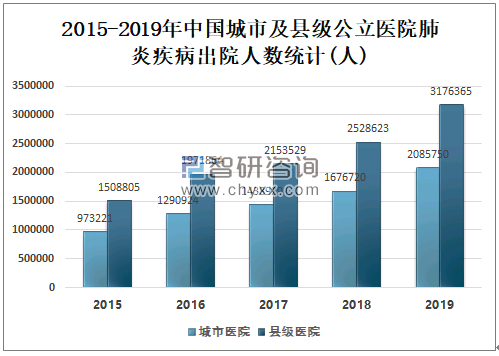 2019年中国城市医院肺炎疾病出院人数为2085750人,较2018年增加了409030人;县级医院肺炎疾病出院人数为3176365人,较2018年增加了647742人。