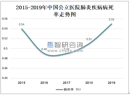 中国公立医院肺炎疾病病死率呈上升趋势,2018年中国公立医院肺炎疾病病死率为0.51%,较2017年增长了0.02%;2019中国公立医院肺炎疾病病死率为0.55%,较2018年增长了0.04.