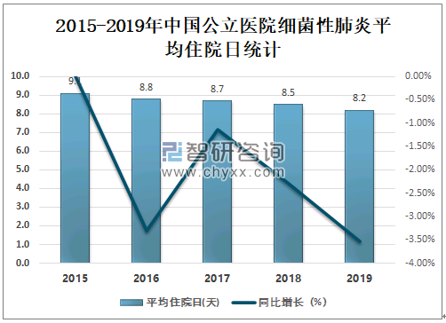 随着中国医疗水平的不断提升,中国公立医院细菌性肺炎平均住院日逐年减少,2019年中国公立医院细菌性肺炎平均住院日为8.2天,较2018年减少了0.3天,同比减少3.53%。