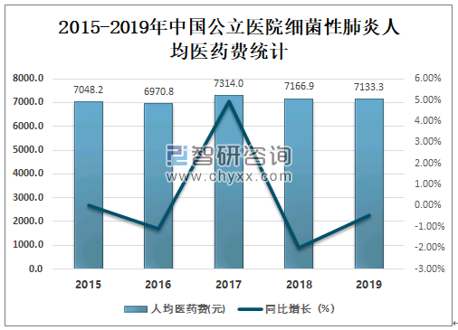 2019年中国公立医院细菌性肺炎人均医药费为7133.3元,较2017年减少了33.6元,同比减少0.47%。