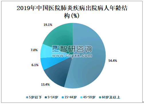 2019年中国医院肺炎疾病5岁以下出院病人占出院总人数的54.4%,占比最大;5~14岁出院病人占出院总人数的13.4%;15~44岁出院病人占出院总人数的6.1%;45~59岁出院病人占出院总人数的7.0%;60岁及以上出院病人占出院总人数的19.1%。