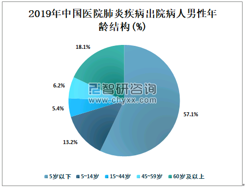 2019年中国医院肺炎疾病5岁以下出院病人(男性)占出院总人数(男性)的57.1%,占比最大;5~14岁出院病人(男性)占出院总人数(男性)的13.2%;15~44岁出院病人(男性)占出院总人数(男性)的5.4%;45~59岁出院病人(男性)占出院总人数(男性)的6.2%;60岁及以上出院病人(男性)占出院总人数(男性)的18.1%。
