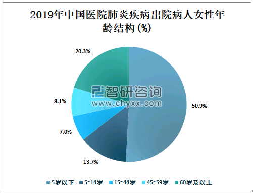 2019年中国医院肺炎疾病5岁以下出院病人(女性)占出院总人数(女性)的57.1%,占比最大;5岁以下出院病人(女性)占出院总人数(女性)的50.9%;5~14岁出院病人(女性)占出院总人数(女性)的13.7%;15~44岁出院病人(女性)占出院总人数(女性)的7.0%;45~59岁出院病人(女性)占出院总人数(女性)的8.1%;60岁及以上出院病人(女性)占出院总人数(女性)的20.3%。