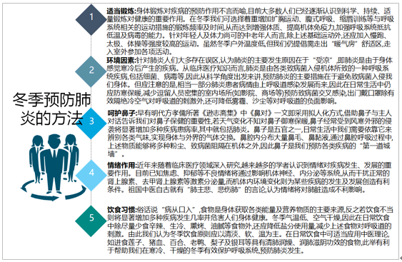 根据既往经验而言,进入12月份后各类呼吸系统疾病发生率均呈显著上升趋势,加之冬季气压、气流等因素共同作用导致环境质量下降,因此针对身体素质较差的老人、小孩而言更应采取有效措施预防呼吸系统疾病。提示公众需加强对肺炎的认知度,准确掌握冬季预防肺炎的有效措施,从而降低自身及家人肺炎发生几率,使人们能够安全过冬。冬季预防肺炎的方法如下: