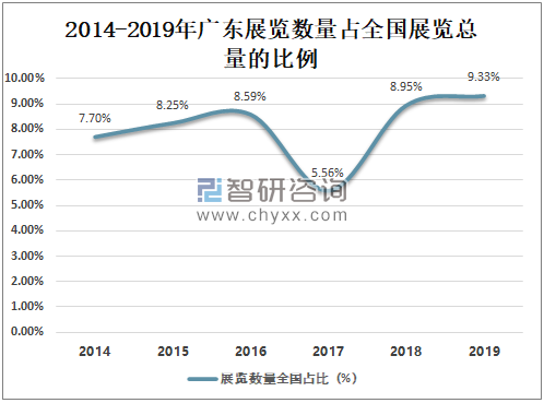 智研咨询发布的《2021-2027年中国展览行业市场全面调研及市场规模预测报告》数据显示:总体来看广东展览数量占全国展览总量的比例呈上升趋势,2019年广东展览数量占全国展览总量的9.33%,较2018年增长了0.38%。