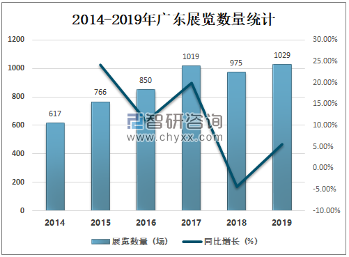 近年来,中国展览业快速发展,已经成为构建现代市场体系和开放型经济体系的重要平台,在我国经济社会发展中的作用日益凸显。会展业已成为展示大国外交的重要平台。随着经济全球化水平的不断提升,会展行业在促进贸易往来、技术交流、信息沟通、经济合作及增加就业等方面发挥着日益重要的作用。2019年广东省展览面积全国排名第二,在全国展览行业占据重要的位置。总体来看广东展览数量呈增长趋势,2019年广东展览数量为1029场,较2018年增加了54场,同比增长率为5.54%。