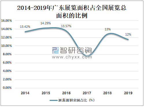 2019年广东展览面积占全国展览总面积的比例有所下滑,2019年广东展览面积占全国展览总面积的12%,较2018年减少了1.27%。