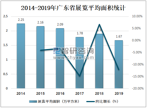 总体来看广东省展览平均面积呈下滑趋势,2019年广东省展览平均面积为1.67万平方米,较2018年减少了0.23万平方米,同比减少12.11%。