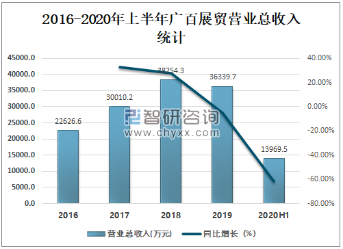 2016-2018年广百展贸营业总收入逐年增加,2019年较2018年有所下滑,2019年广百展贸营业总收入为36339.7万元,较2018年减少了1914.61万元,2020年受新冠肺炎疫情影响,2020年上半年广百展贸营业总收入大幅下滑,2020年上半年广百展贸营业总收入为13969.5万元。