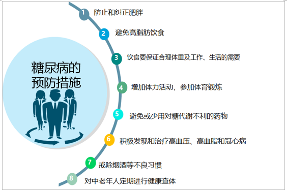 糖尿病的预防措施主要有:(1)防止和纠正肥胖。(2)避免高脂肪饮食。(3)饮食要保证合理体重及工作、生活的需要。食物成分合理,碳水化合物以非精制、富含可溶性维生素为好,占食物总热量的50%~65%,脂肪占食物总热量的15%~20%(多不饱和脂肪酸与饱和脂肪酸比例大于1.5),蛋白质占食物总热量的10%~15%。多吃蔬菜。(4)增加体力活动,参加体育锻炼。(5)避免或少用对糖代谢不利的药物。(6)积极发现和治疗高血压、高血脂和冠心病。(7)戒除烟酒等不良习惯。(8)对中老年人定期进行健康查体,除常规空腹血糖外,应重视餐后2小时血糖测定。