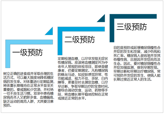 三级预防。目的是预防或延缓糖尿病慢性合并症的发生和发展,减少伤残和死亡率。糖尿病人很容易并发其他慢性病,且易因并发症而危及生命。因此,要对糖尿病慢性合并症加强监测,做到早期发现。早期诊断和早期治疗糖尿病,常可预防并发症的发生,使病人能长期过接近正常人的生活。