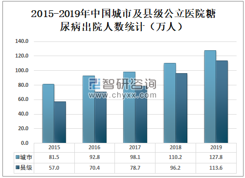 2019年中国城市公立医院糖尿病出院人数为127.8万人,较2018年增加了17.6万人;2019年中国县级公立医院糖尿病出院人数为113.6万人,较2018年增加了17.4万人。