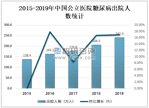 糖尿病是三大慢性病之一,随着社会生活的发展,糖尿病患者逐年增加。糖尿病虽然属于慢性病,不能直接给患者带来不适,但是长期患有糖尿病会引起各种并发症,从而危害患者健康甚至危及生命。糖尿病的主要危害是引起并发症从而威胁病人的健康和生命。近年来中国公立医院糖尿病出院人数快速增长,2019年中国公立医院糖尿病出院人数达241.4万人,较2018年增加了34.9万人,同比增长16.92%,预计未来将继续保持增长趋势。