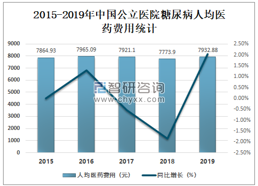 2019年中国公立医院糖尿病人均医药费用为7932.88元,较2018年增加了158.98元,同比增长2.05%。