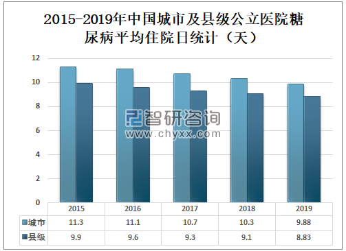 2019年中国城市公立医院糖尿病平均住院日为9.88天,较2018年减少了0.42天;2019年中国县级公立医院糖尿病平均住院日为8.83天,较2018年减少了0.27天。
