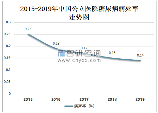 中国公立医院糖尿病病死率逐年下降,2019年中国公立医院糖尿病病死率为0.14%,较2018年减少了0.01%。