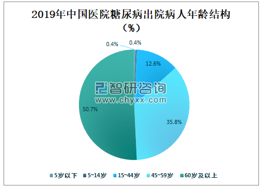 2019年中国医院60岁及以上糖尿病出院病人占全国糖尿病总出院病人的50.7%,占比最大;45~59岁糖尿病出院病人占全国糖尿病总出院病人的35.8%;15~44岁糖尿病出院病人占全国糖尿病总出院病人的12.6%;5~14岁糖尿病出院病人占全国糖尿病总出院病人的0.4%;5岁以下糖尿病出院病人占全国糖尿病总出院病人的0.4%。